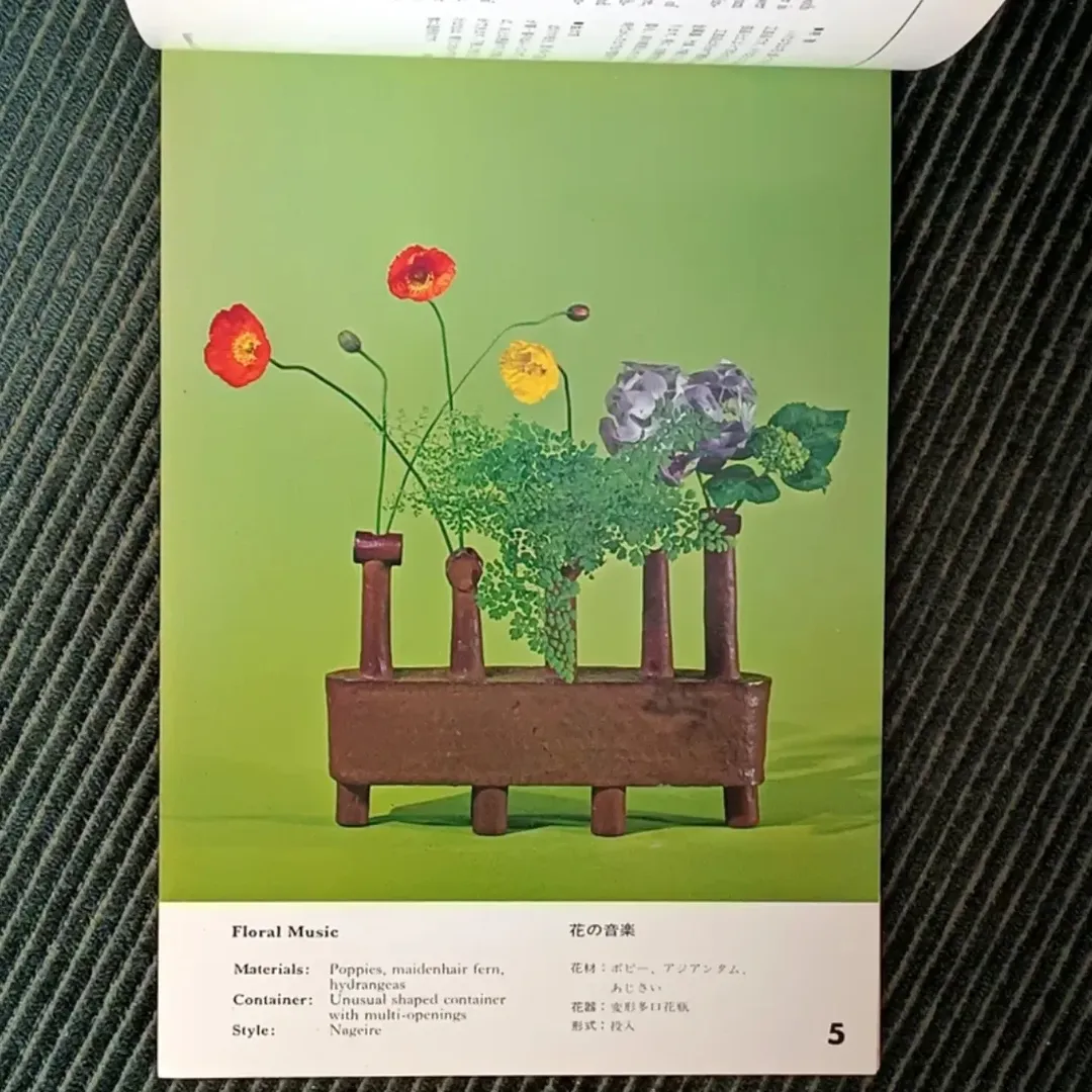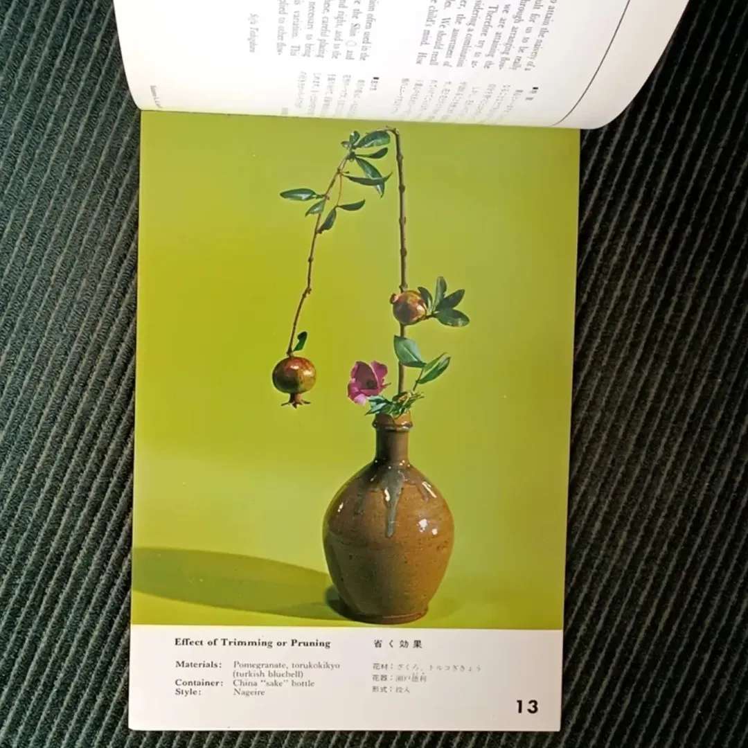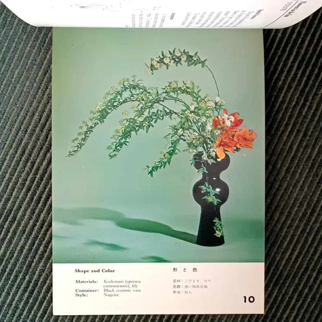 این کتاب بر یکی از سبکهای کلاسیک و اصلی گلآرایی ژاپنی، یعنی ناگهایره (Nageire) تمرکز دارد؛ سبکی که معنای تحتاللفظی آن «انداختن» یا «درون افکندن» است. در این شیوه، چیدمان گلها و شاخهها حالتی آزادتر و طبیعیتر دارد. عناصر گیاهی معمولاً در گلدانهای بلند قرار میگیرند و از پایههای فلزی (کنزان) استفاده نمیشود. این رویکرد در تقابل با سبک رسمیتر موریبانا (Moribana) قرار میگیرد.